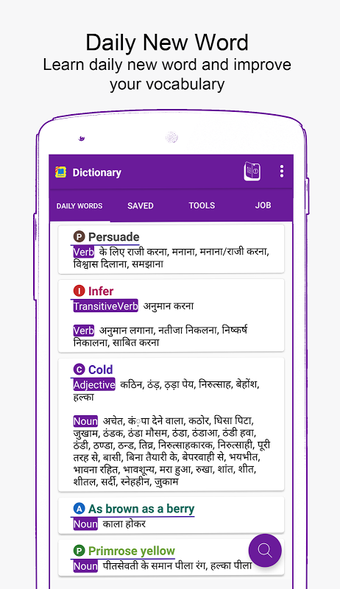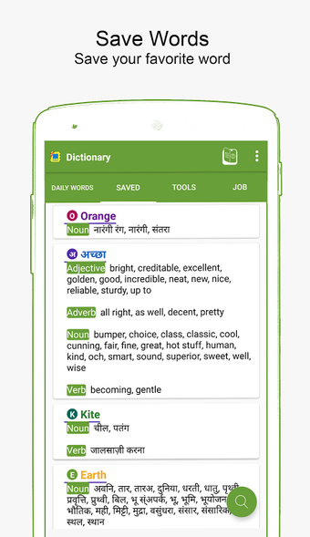 Ta aplikacja jest bardzo przydatna do nauki języka angielskiego i hindi oraz dla tych, którzy chcą poprawić swoje słownictwo.